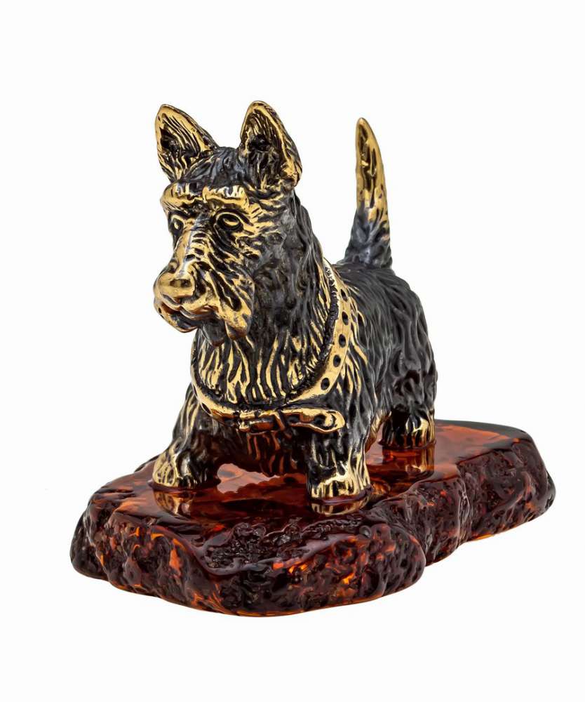 Фигурка Собака Скотч Терьер из бронзы и янтаря